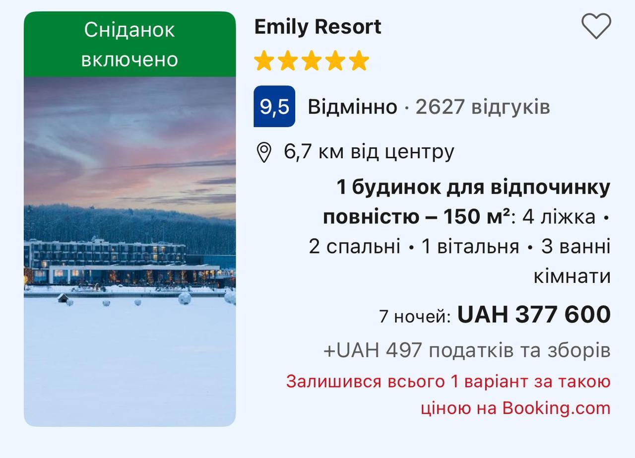 Окрім Буковеля, серед туристів також популярний курорт Emily Resort у Львівській області, де вартість відпочинку за 7 ночей складає 377 600 гривень.