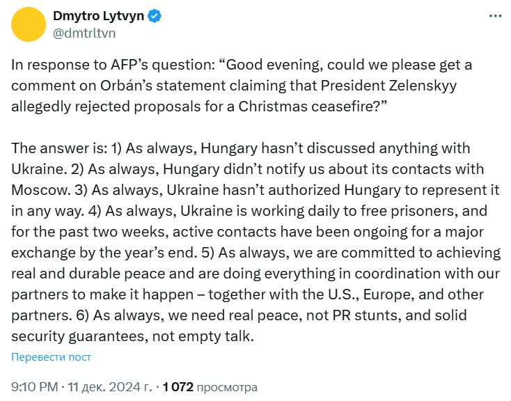 "У відповідь на запитання AFP: "Доброго вечора, чи не могли б ви прокоментувати заяву Орбана про те, що президент Зеленський нібито відхилив пропозиції про різдвяне припинення вогню?" Відповідь: 1) Як завжди, Угорщина нічого не обговорювала з Україною, радник президента.