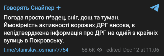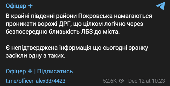 "Ймовірність активності ворожих ДРГ висока, є непідтверджена інформація про ДРГ на одній з крайніх вулиць в Покровську", - пише командир взводу 24ОШБ "Айдар" Станіслав Бунятов.
