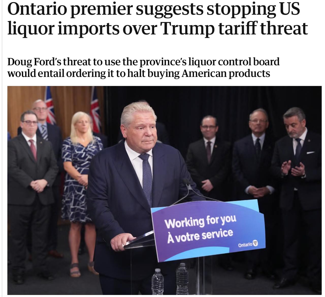 The Guardian пише, що влада провінції Онтаріо може ввести обмеження на імпорт алкоголю зі США - зокрема, віскі та бурбона. Також раніше в Онтаріо погрожували зупинити постачання електроенергії до Штатів.