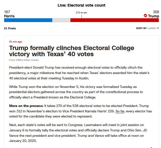 "Хоча Трамп виграв вибори 5 листопада, його перемога була офіційно оформлена, коли виборці президента зібралися по всій країні в рамках конституційного процесу, щоб офіційно обрати президента", - йдеться у публікації.
