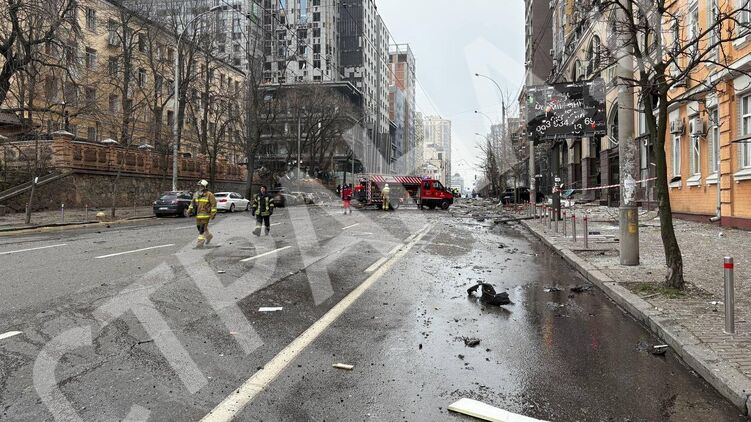 Момент прильоту у районі бізнес-центру на вулиці Великій Васильківській у Києві.