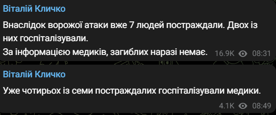Мер столиці Віталій Кличко повідомив, що під час ранкової ракетної атаки постраждали семеро людей.