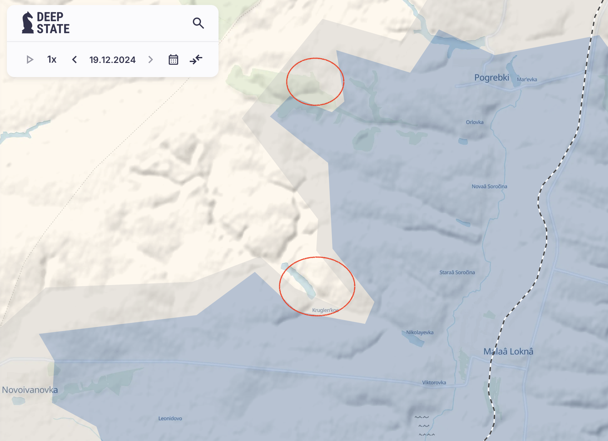 Росіяни просунулися в Курській області в районі села Кругленьке, свідчить карта Deep State. Видно просування у бік Малої Локні на півночі плацдарму ЗСУ.