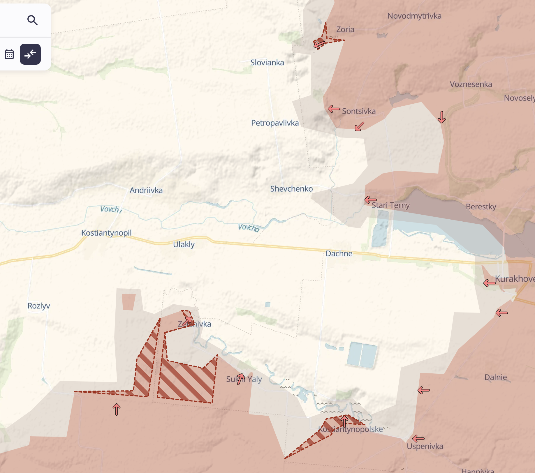 Попутно військовий паблік Deep State пише, що війська РФ остаточно ліквідували "Успенівський мішок" на південь від Курахового, захопивши Трудове та Успенівку. Також зайняте село Константинопольське.