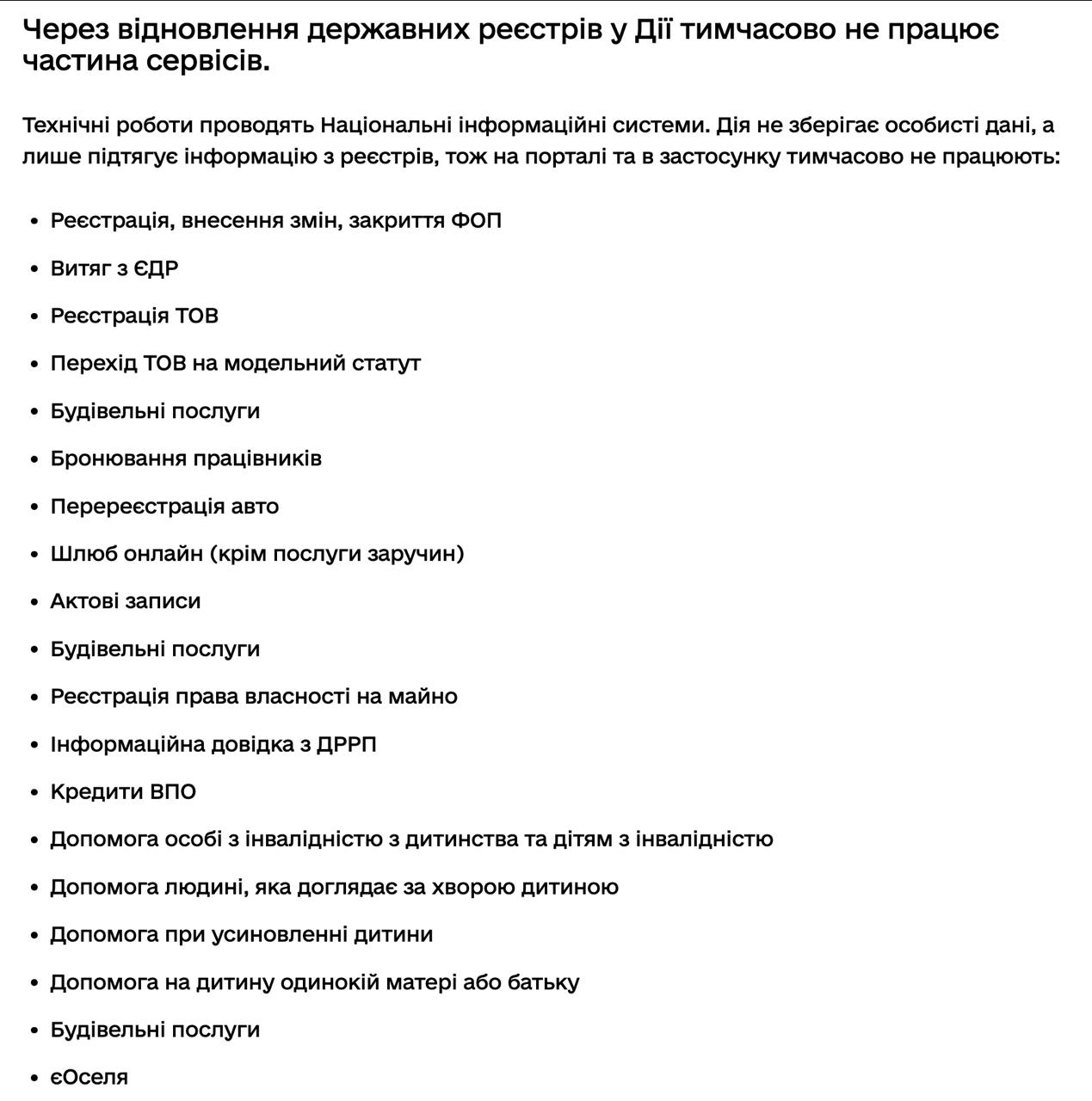 На початку "Дія" заявила, що сервіси не працюють через "оновлення державних реєстрів". В результаті відключилися такі функції як бронювання працівників, реєстрація та закриття ФОП, витяг з Єдиного держреєстру, перереєстрація авто, шлюб онлайн, е-Відновлення та інші.