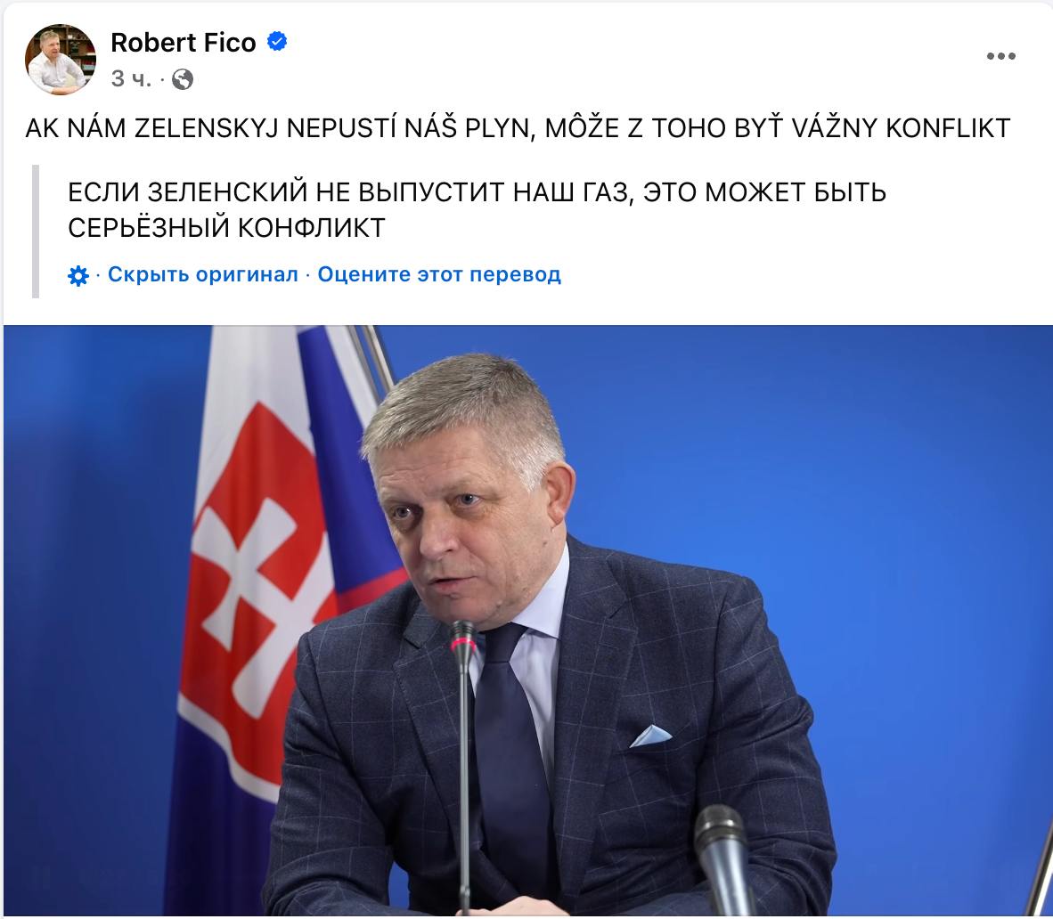 "Якщо Зеленський не пустить наш газ, може виникнути серйозний конфлікт. Чому це має йти тільки від нас туди? Чому не може бути якогось прояву солідарності до нас?", - заявив прем'єр.