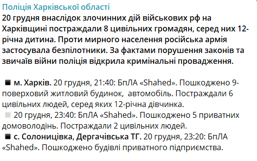 Сьогодні вночі росіяни двічі атакували безпілотниками Харків. Поранено восьмеро людей, серед них 12-річна дівчина.
