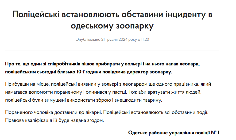 Сьогодні вранці в Одеському зоопарку леопард напав працівника, який прийшов прибирати у вольєрі. Поліцейські змушені були використовувати зброю та знешкодити тварину.