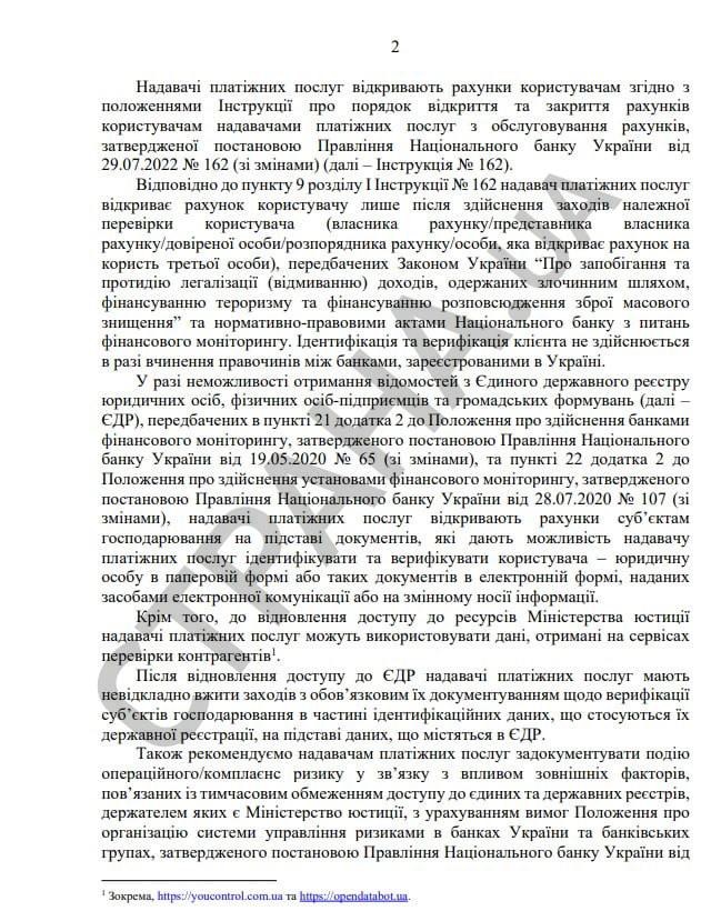 - Після відновлення доступу до держреєстрів банки та фінкомпанії зобов'язані невідкладно перевіряти ще раз дані клієнтів, яким відкривали рахунки без реєстрів.