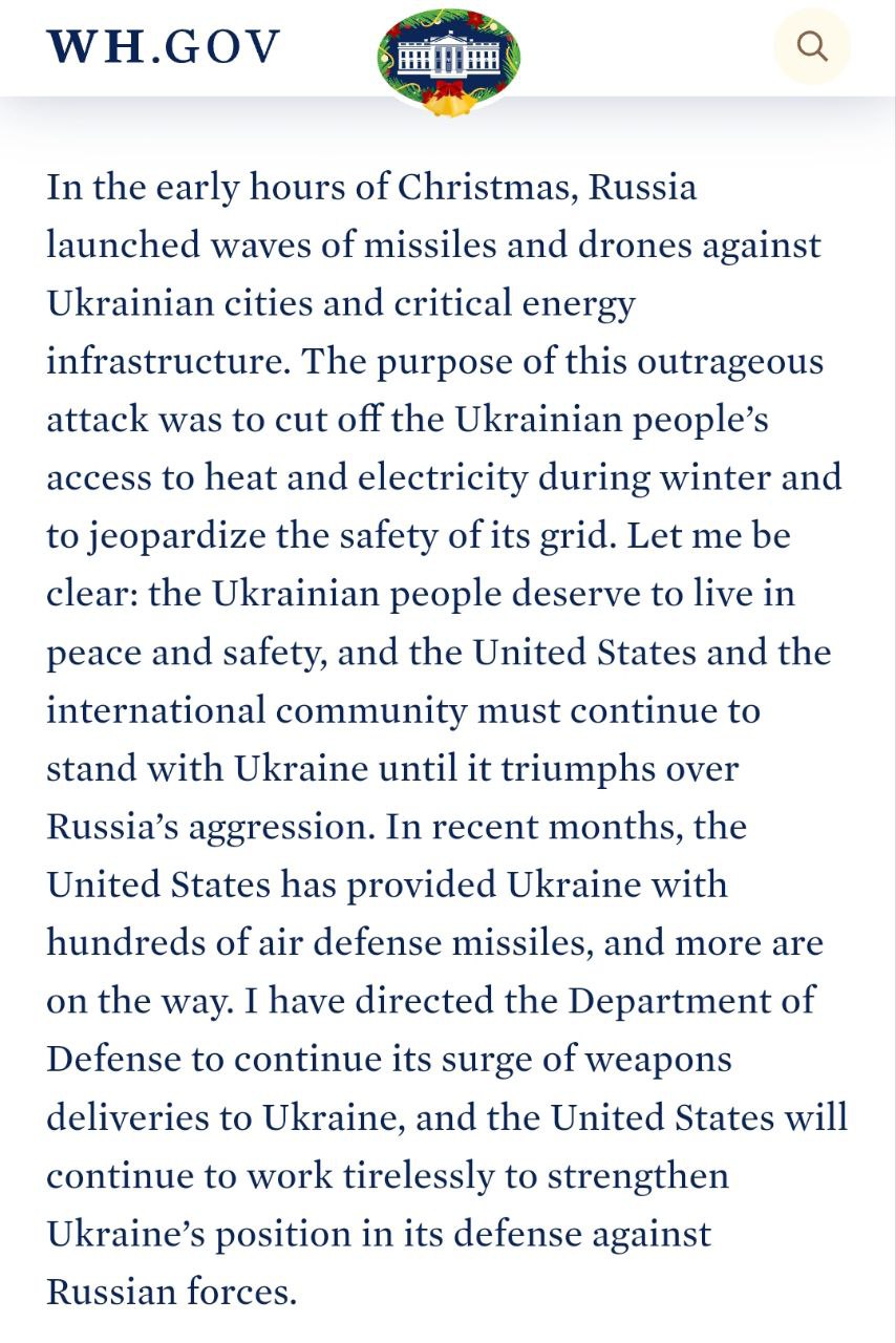 Президент США Джо Байден доручив Пентагону посилити постачання зброї в Україну після ракетного удару в ніч на 25 грудня.