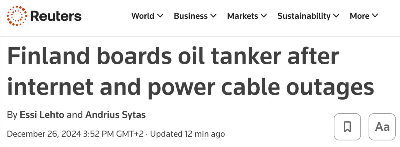 Фінляндія затримала нафтовий танкер Eagle S під прапором Островів Кука, який прямував з Росії, за підозрою в пошкодженні одразу чотирьох кабелів у Балтійському морі: одного - електроживлення та трьох - інтернет-ліній, що з'єднують Фінляндію та Естонію.