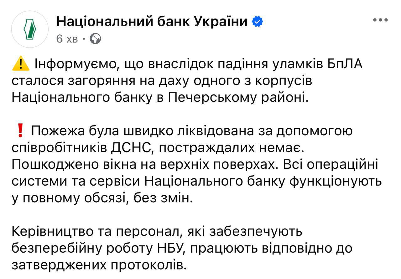 Тим часом у НБУ повідомили, що після атаки "Шахедів" у Києві горів дах корпусу Нацбанку на Печерську.