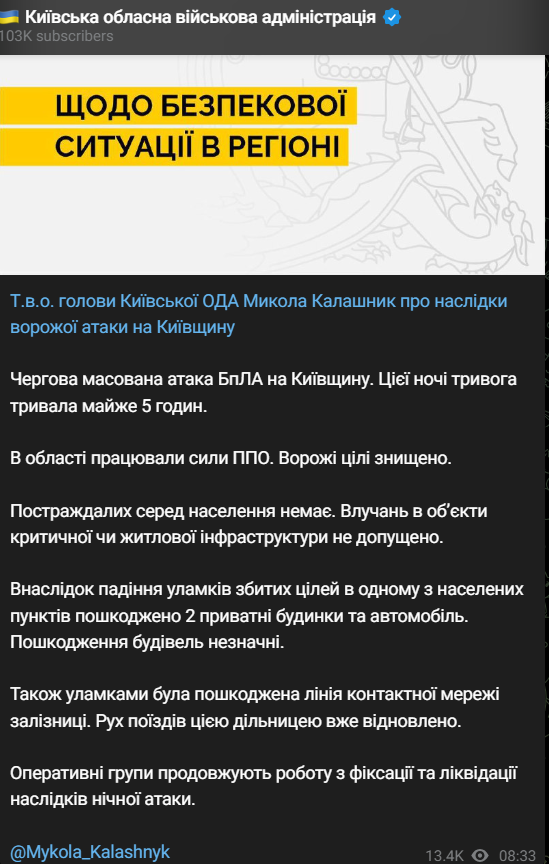Також Київська ОВА повідомляє, що внаслідок падіння уламків збитих цілей в одному з населених пунктів пошкоджено 2 приватні будинки та автомобіль.