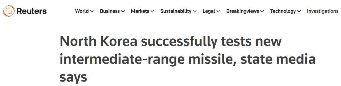 Корейська Народно-Демократична Республіка (КНДР) провела випробування нової гіперзвукової балістичної ракети середньої дальності.