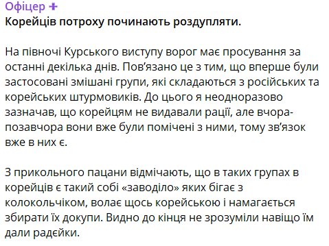 "На півночі Курського виступу ворог має поступ за останні кілька днів. Пов'язано це з тим, що вперше були застосовані змішані групи, що складаються з російських і корейських штурмовиків", - написав військовий.