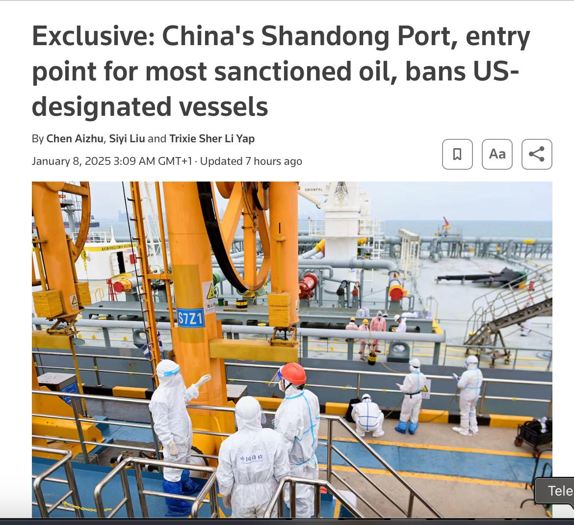 Обмеження запровадили після того, як підсанкційний танкер Eliza II розвантажився у порту Яньтай на початку січня. Тепер у портах заборонено швартуватись, розвантажуватись або надавати послуги судам зі списку Управління з контролю за іноземними активами при Міністерстві фінансів США.