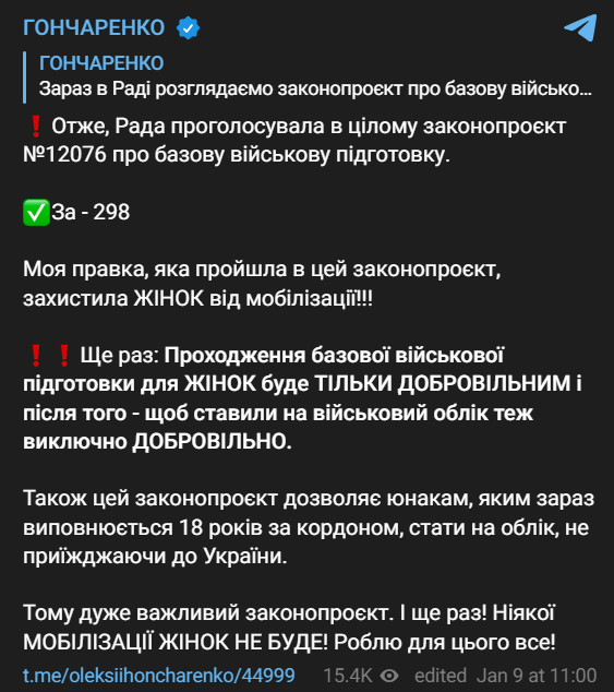 Також народний депутат Олексій Гончаренко повідомив, що до законопроекту внесли виправлення, яке скасовує "перший крок" до мобілізації жінок.
