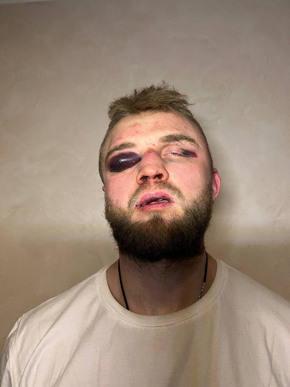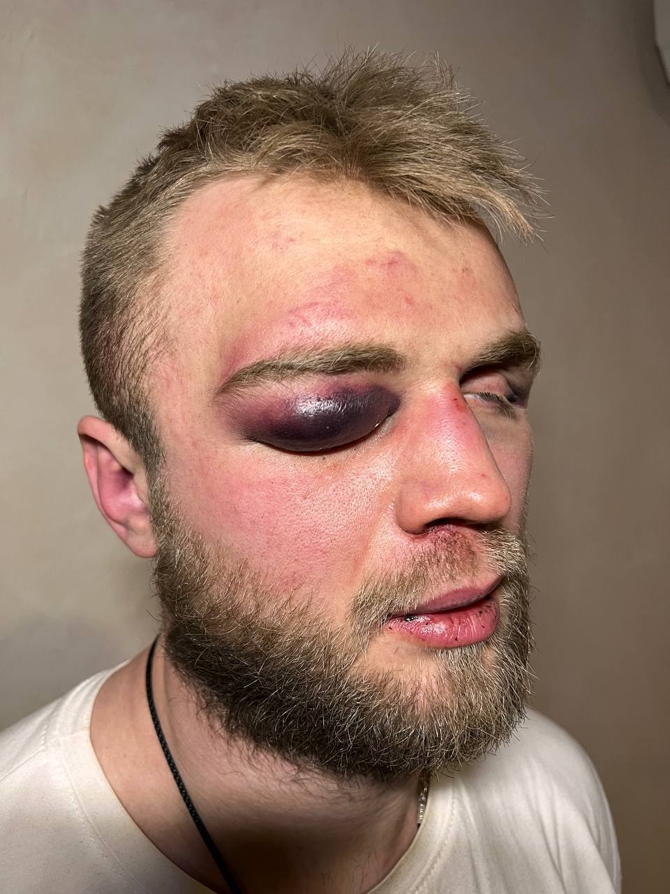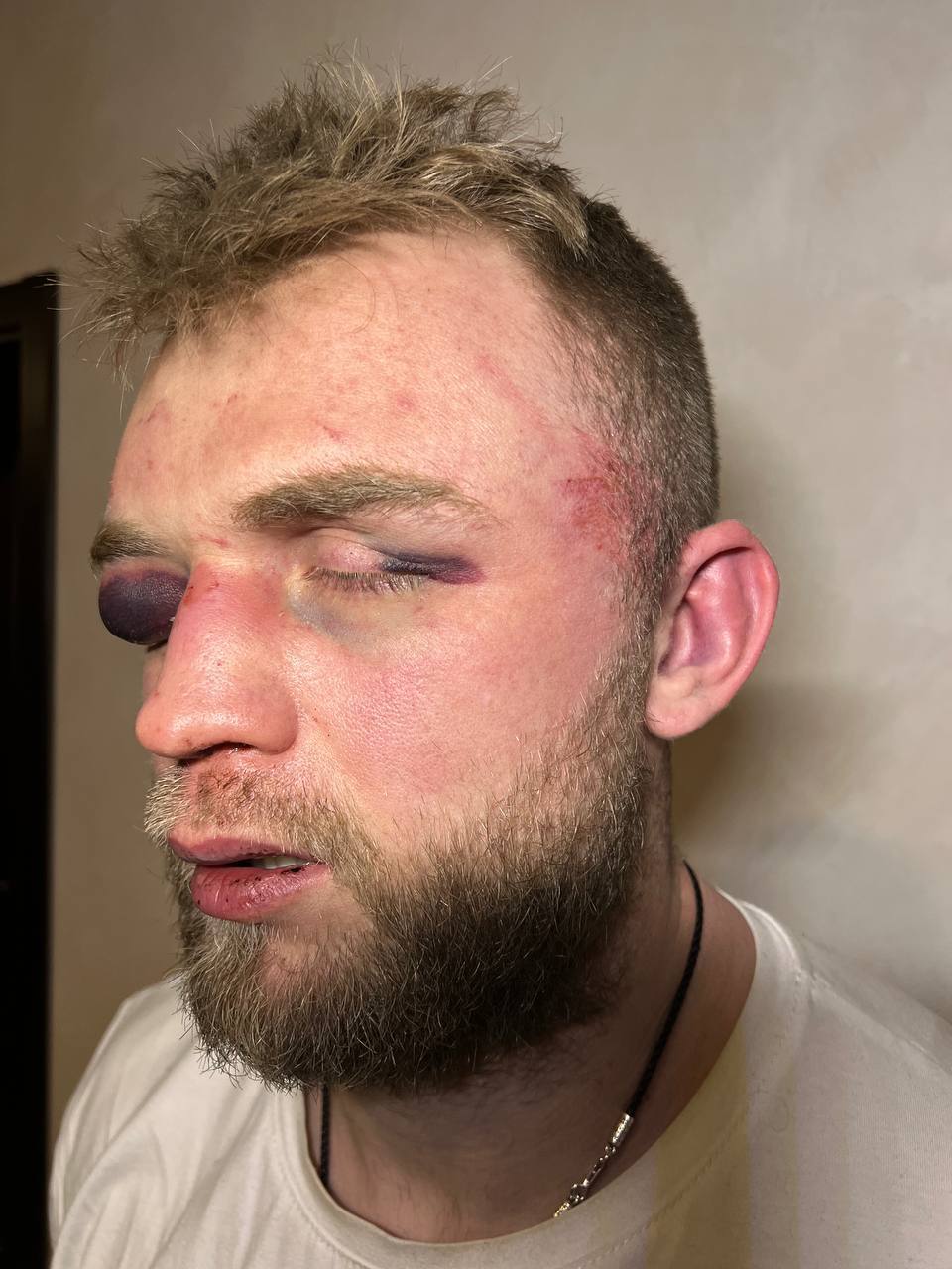 Дмитрук опублікував фото, на яких у нього повністю набряк від ударів праве око та деформовано череп, зламані ніс та вуха.