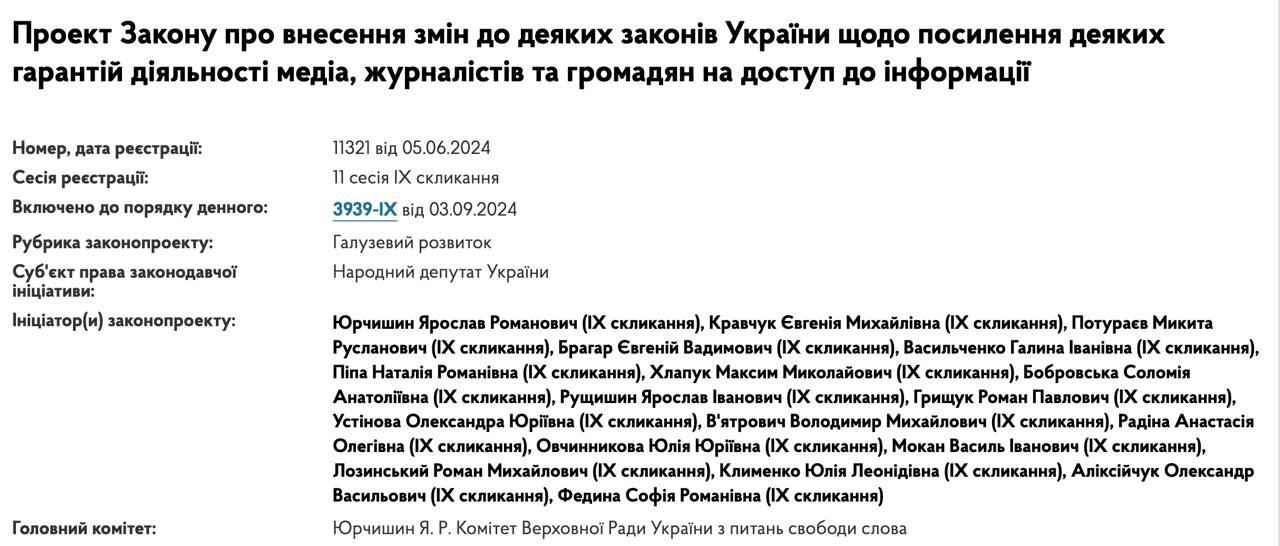 Відповідний законопроект №11 321, автором якого став голова комітету зі свободи слова Ярослава Юрчишина, ухвалили парламент 14 січня.
