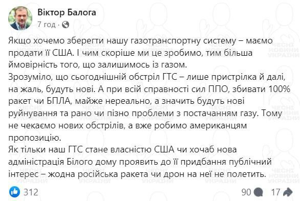 "Якщо хочемо зберегти нашу газотранспортну систему - повинні продати її США. І чим швидше ми це зробимо, тим більша ймовірність того, що залишимося з газом. Зрозуміло, що сьогоднішній обстріл ГТС - тільки пристрілка і далі, на жаль, будуть нові. всієї справності сил ППО збивати 100% ракет або БПЛА майже нереально, а значить, будуть нові руйнування і рано чи пізно проблеми з Постачанням газу. Тому не чекаємо нових обстрілів, а вже робимо американцям пропозицію. він.