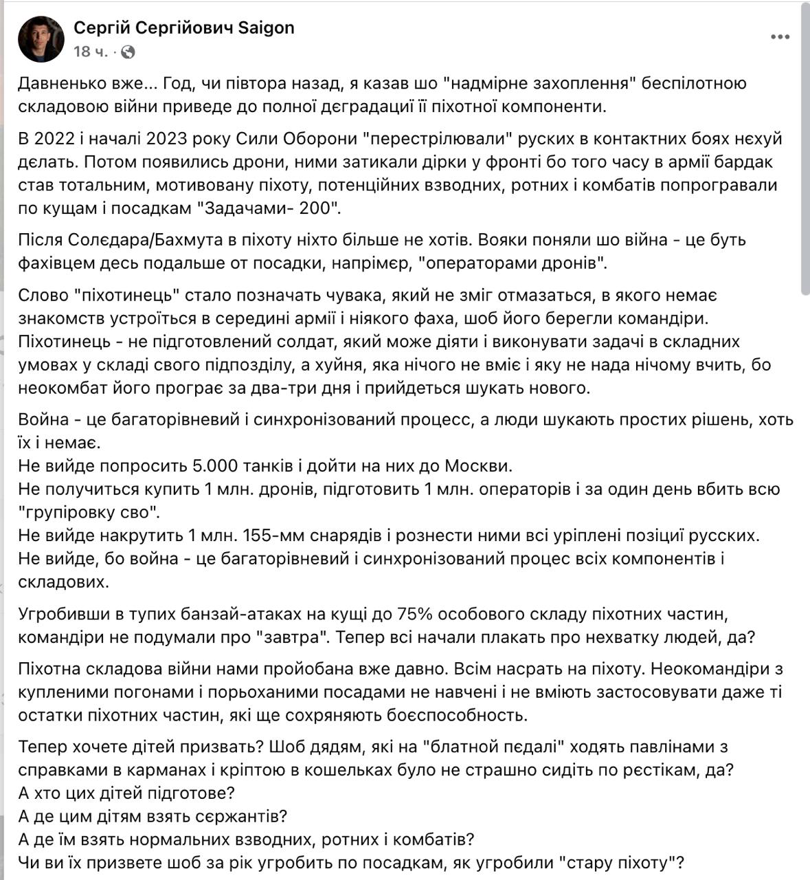 За його словами, піхотна складова "нами про@обана вже давно, всім на@рать на піхоту". До цього призвело, зокрема, "надмірне захоплення" безпілотниками та неадекватні завдання керівництва із "купленими погонами".
