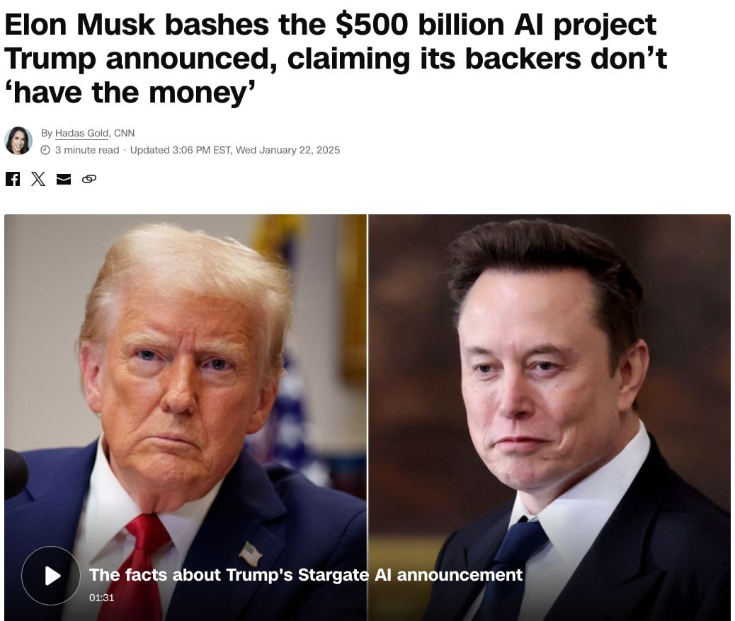Ілон Маск розкритикував план Дональда Трампа щодо створення компанії StarGate для розвитку штучного інтелекту з інвестиціями у 500 мільярдів доларів.