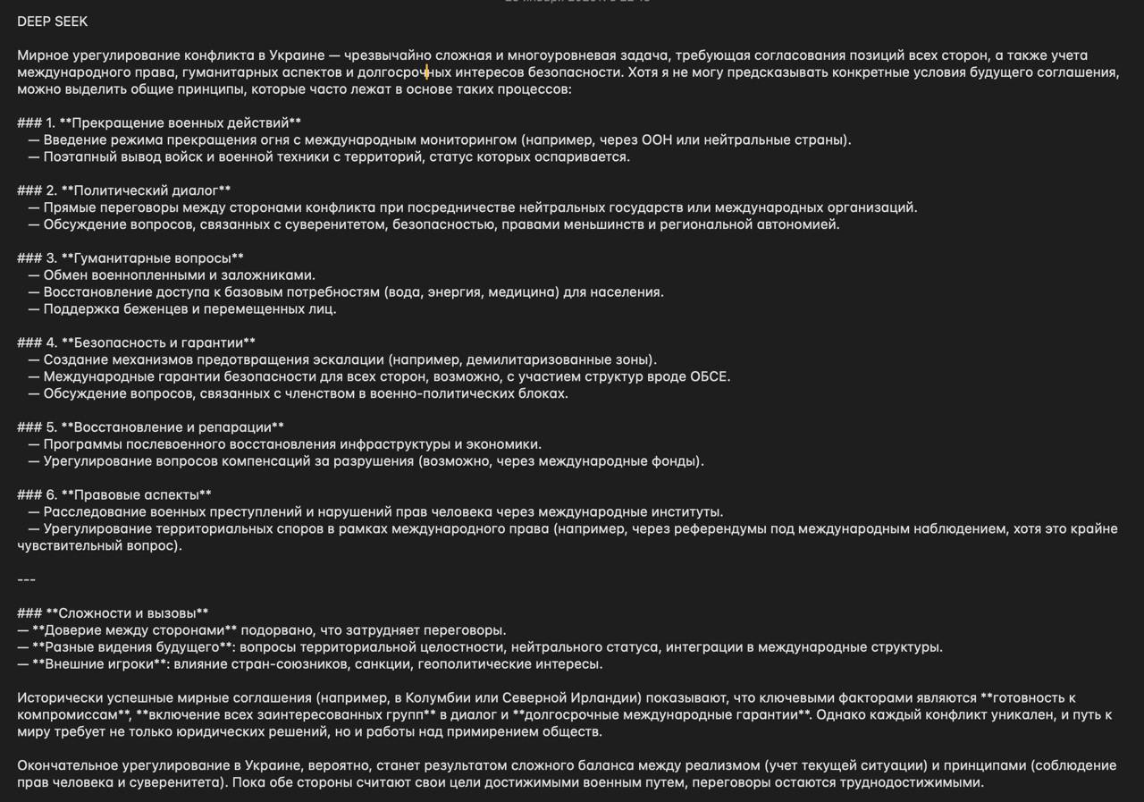 "Історично успішні мирні угоди (наприклад, у Колумбії чи Північній Ірландії) показують, що ключовими факторами є готовність до компромісів, включення всіх зацікавлених груп у діалог та довгострокові міжнародні гарантії", - пише DeepSeek.