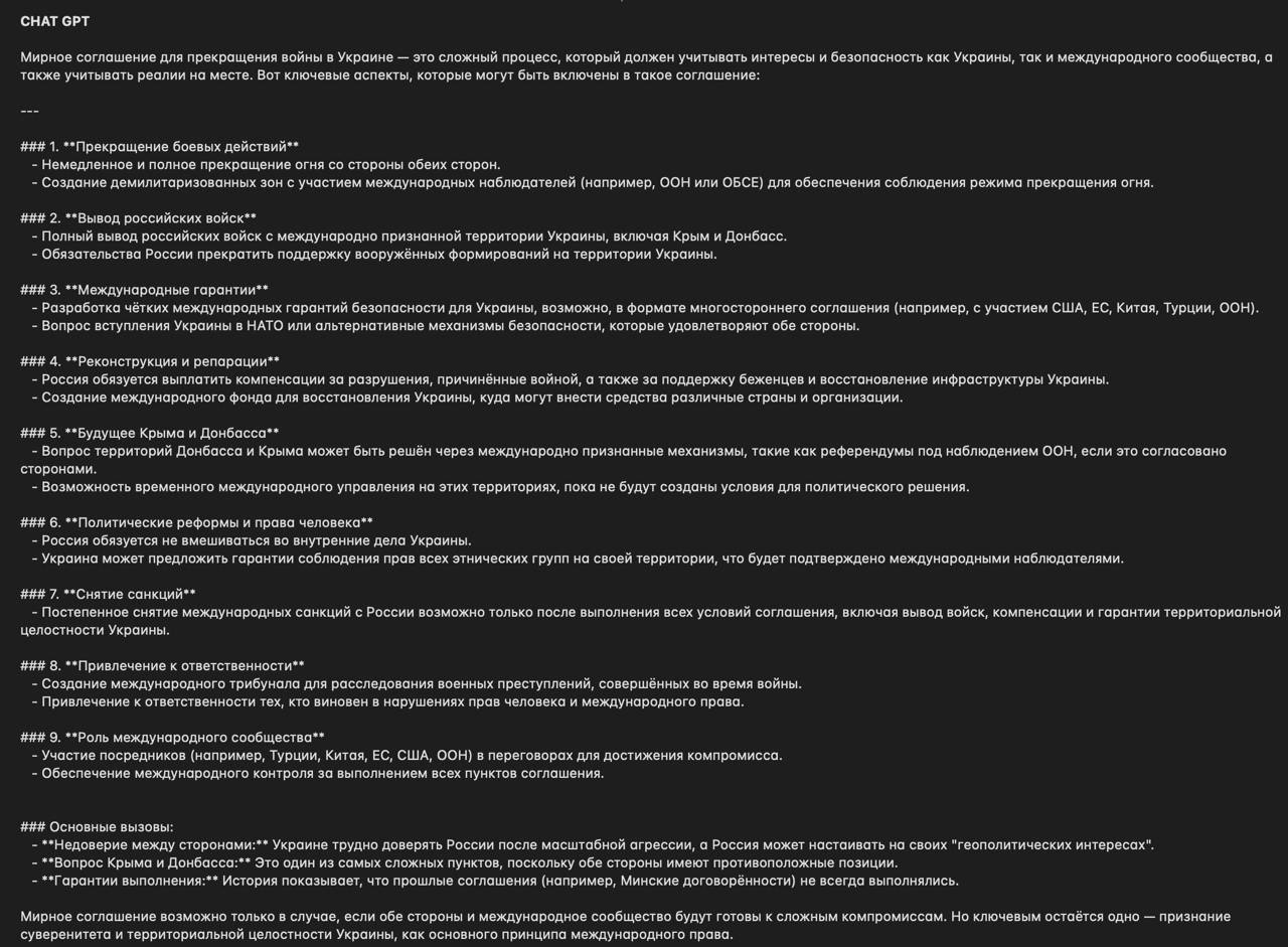 Серед складнощів при укладенні угоди американський чат-бот називає недовіру Києва до Москви та геополітичні інтереси РФ. Підсумковий висновок ChatGPT звучить так: "Мирна угода можлива лише у випадку, якщо обидві сторони та міжнародне співтовариство будуть готові до складних компромісів. Але ключовим залишається одне — визнання суверенітету та територіальної цілісності України".