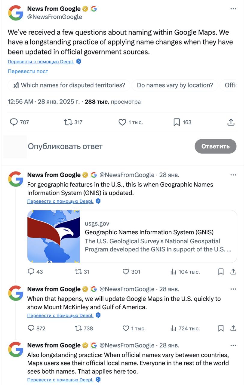 "Якщо офіційні назви в різних країнах відрізняються, користувачі Google Maps бачитимуть офіційну місцеву назву. Для всіх інших користувачів по всьому світу відображатимуться обидва варіанти", - заявила компанія в пості в соціальній мережі.