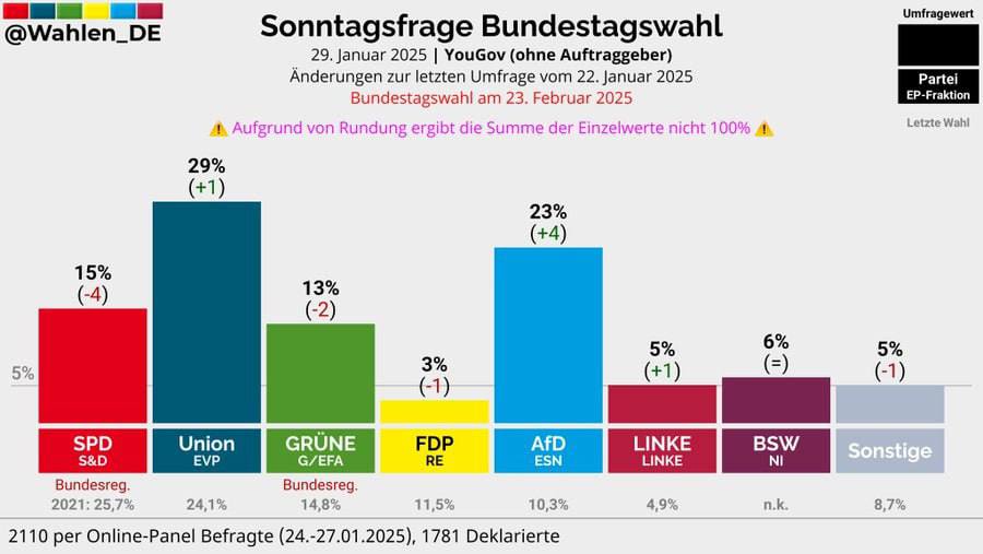 У парламенті також можуть бути представлені Союз Сари Вагенкнехт (6%, як і минулого тижня) та Ліва партія (5%, +1%).