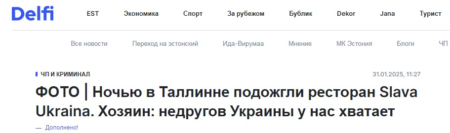 "За попередньою інформацією, це міг бути підпал. Згідно з попередньою інформацією, було розбито вікно ресторану Slava, що знаходиться на першому поверсі, і підпалені його внутрішні приміщення. Обставини події розслідуватимуть у кримінальному провадженні за статтею про пошкодження та знищення майна. Це попередня правова оцінка, оскільки ще триває збирання доказів", - сказала журналістам прес-секретар Департаменту поліції та прикордонної охорони Брітта Сепп.