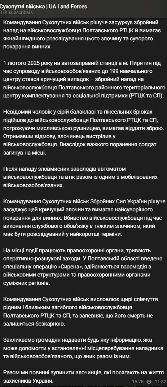 "1 лютого 2025 року на автозаправній станції у місті Пирятин під час супроводу військовозобов'язаних до 199 навчального центру стався кричущий випадок – збройний напад на військовослужбовця Полтавського районного ТЦК", - йдеться у повідомленні.