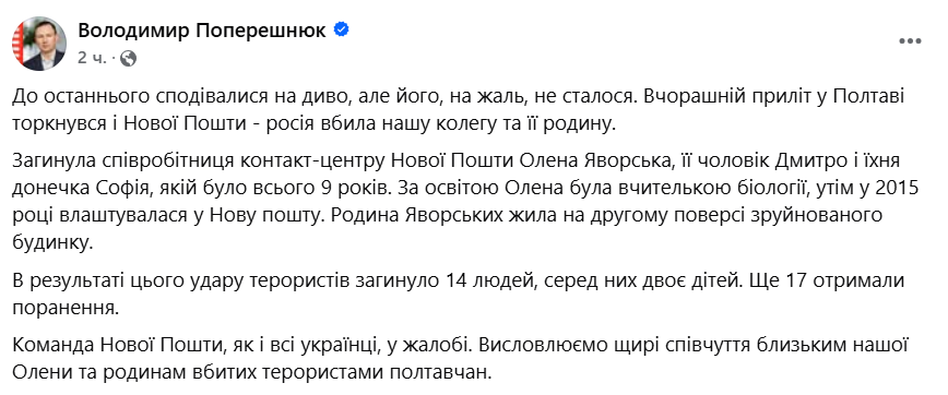 "Загинула співробітниця контакт-центру Нової Пошти Олена Яворська, її чоловік Дмитро та їхня донька Софія, якій було лише 9 років. За освітою Олена була вчителькою біології, але у 2015 році влаштувалася до Нової пошти", - написав Поперешнюк.