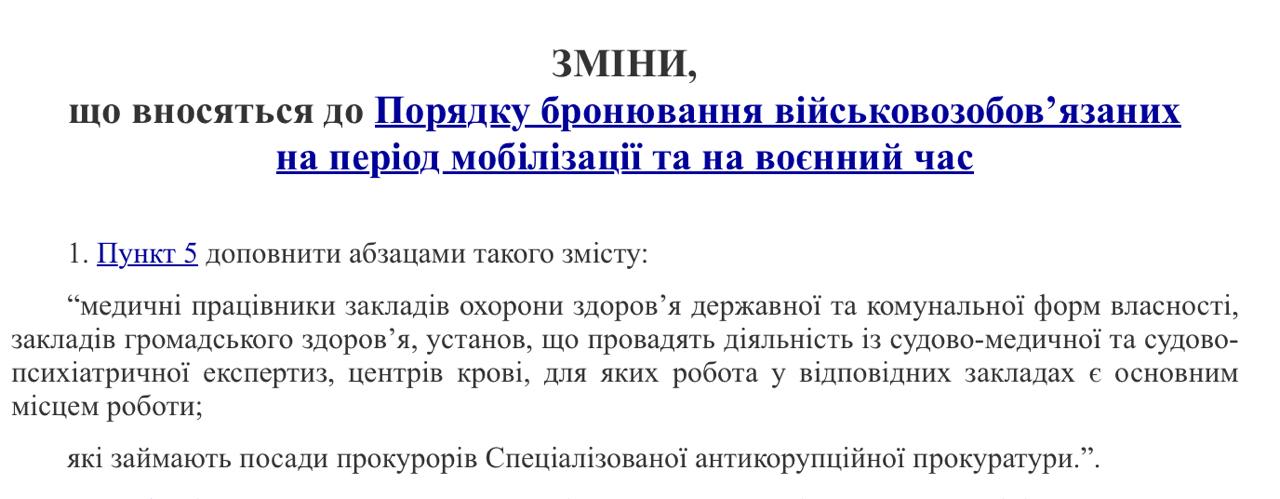 Також у цій постанові забронювали лікарів та медпрацівників, які мають основну роботу в закладах охорони здоров'я державної та комунальної форм власності, установах громадського здоров'я, у судмедекспертизі, центрах крові.