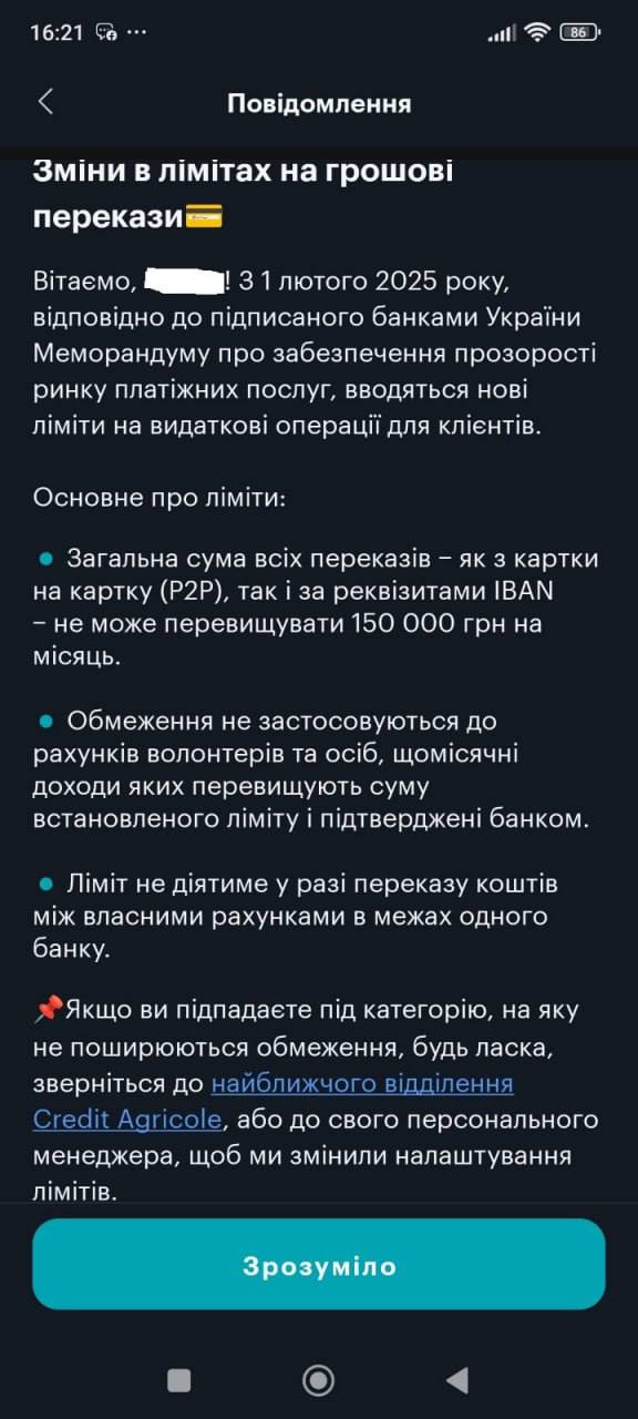 Цікаво, що в "Креді Агріколь Банк" повідомили клієнтів про введення ліміту на перекази у розмірі 150 тисяч гривень на місяць, в який увійдуть два види перерахувань: Р2Р (за номером картки) та IBAN (за номером рахунку) - з уже відомими винятками для переказів між власними рахунками в одному банку, для волонтерів. При цьому в повідомленні "Агріколя" нічого не йдеться про нижню планку платіжного обмеження в 50 тисяч гривень на місяць, хоча в меморандумі вказано діапазон перерахувань у межах 50-150 тисяч гривень залежно від характеристики кожного окремо взятого клієнта (високорисковий або середньо- та низькоризиковий).