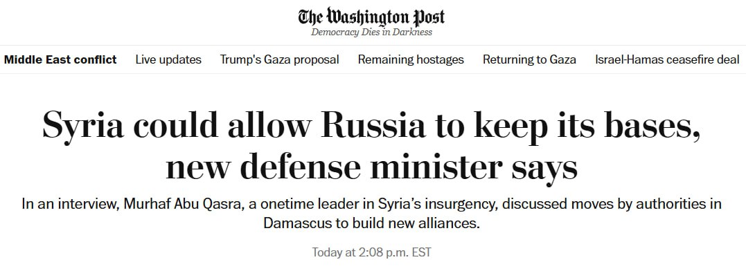 Міністр оборони Сирії Мурахф Абу Касра заявив, що Росія може зберегти свої великі бази в Тартусі та Хмеймімі на узбережжі Середземного моря "доти, доки вимоги Кремля відповідають нашим інтересам".