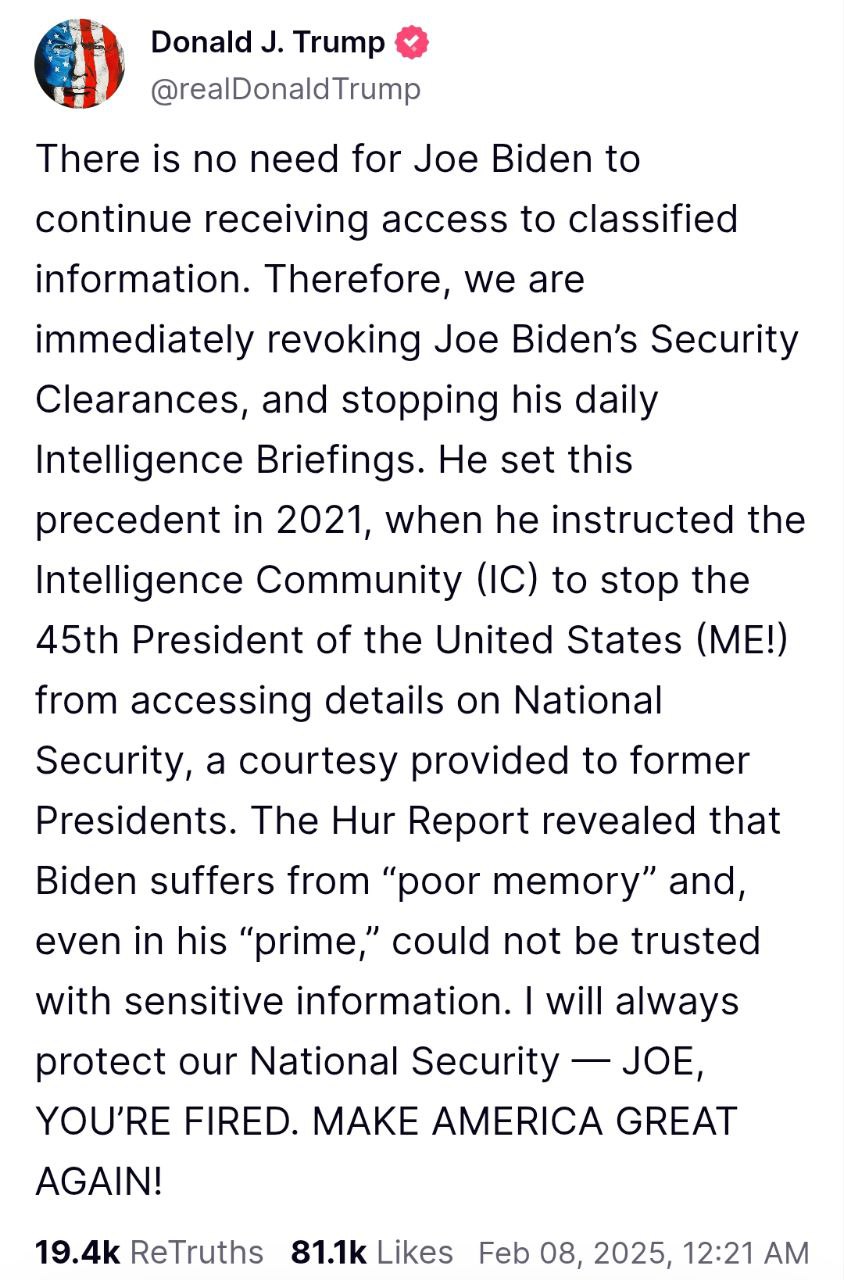 "Мы немедленно отзываем допуски Джо Байдена к секретной информации и прекращаем его ежедневные разведывательные брифинги. Он создал этот прецедент в 2021 году, когда поручил разведывательному сообществу не допустить 45-го президента Соединенных Штатов (МЕНЯ!) к информации о национальной безопасности (любезность, предоставленная бывшим президентам)", - написал президент Соединенных Штатов.