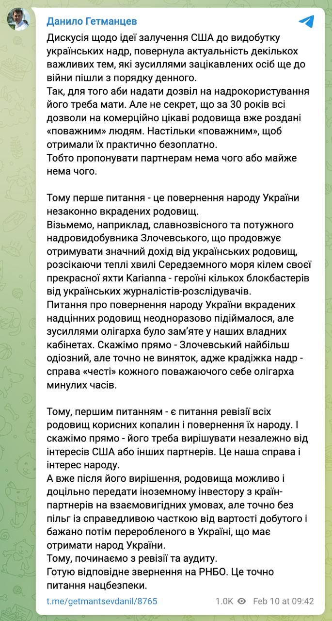 Він додав, що першочерговим питанням зараз є ревізія всіх родовищ корисних копалин та повернення їх народу. Причому це питання, вважає Гетьманцев, слід "вирішувати незалежно від інтересів США чи інших партнерів".
