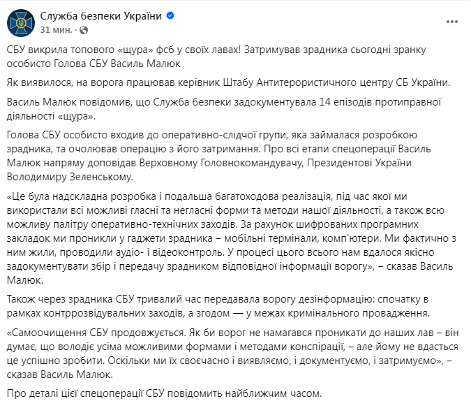 Малюк розповів, що Служба безпеки задокументувала 14 епізодів протиправної діяльності працівника. Голова СБУ входив до оперативно-слідчої групи, яка займалася розробкою чоловіка, і очолював операцію щодо його затримання. Про всі етапи спецоперації Малюк безпосередньо доповідав Володимиру Зеленському.