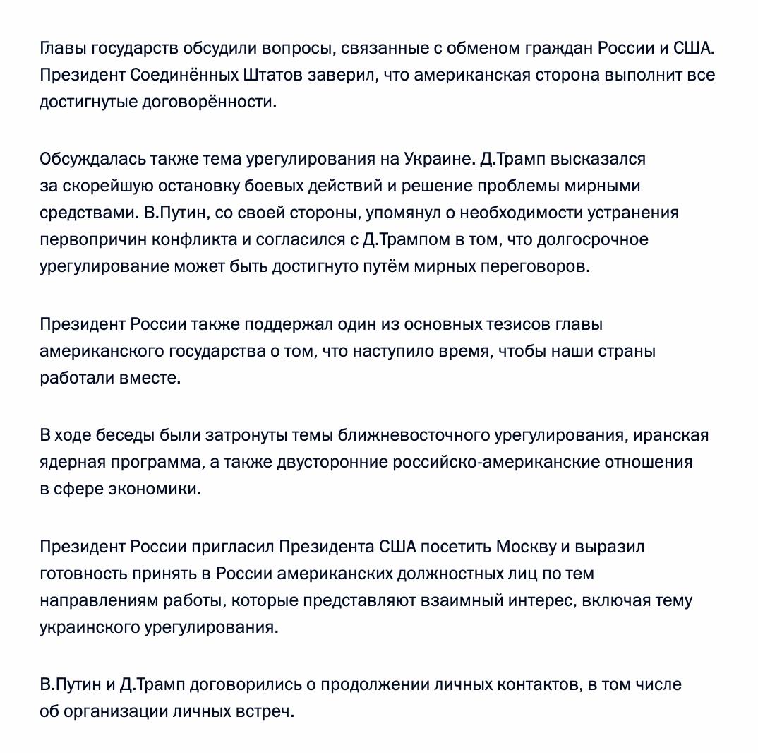 Обговорювали також тему врегулювання в Україні. Д.Трамп висловився за якнайшвидшу зупинку бойових дій та вирішення проблеми мирними засобами. В.Путін, зі свого боку, згадав необхідність усунення першопричин конфлікту і погодився з Д.Трампом у тому, що довгострокове врегулювання може бути досягнуто шляхом мирних переговорів.