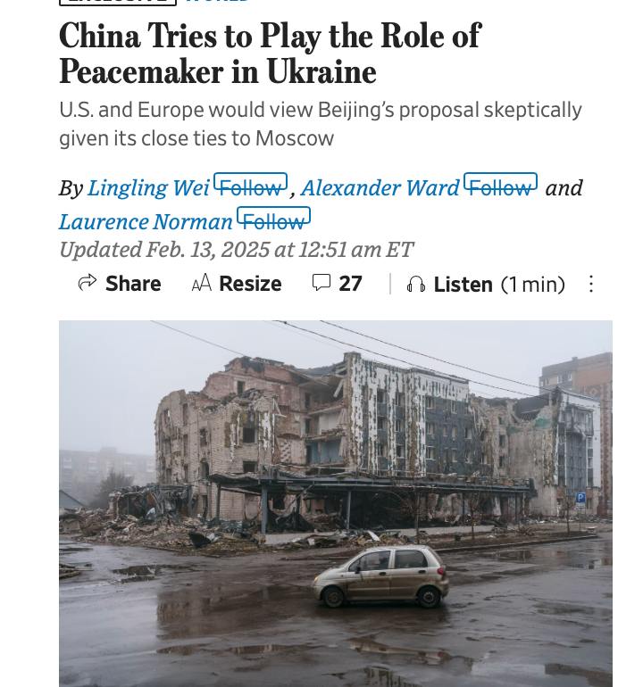 Опитані WSJ європейські чиновники вважають, що Китай влаштовує затягування війни, яка витрачає військові ресурси Європи та США, а також посилює залежність Москви від Пекіна.