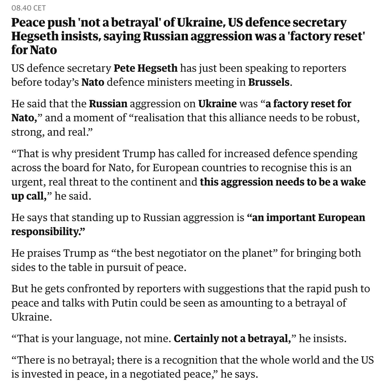 Хегсет назвав Трампа "найкращим перемовником на планеті" за те, що ініціював переговорний процес. Він сказав, що вторгнення РФ стало "перезавантаженням системи для НАТО" і моментом "усвідомлення того, що цей альянс має бути міцним, сильним та реальним".