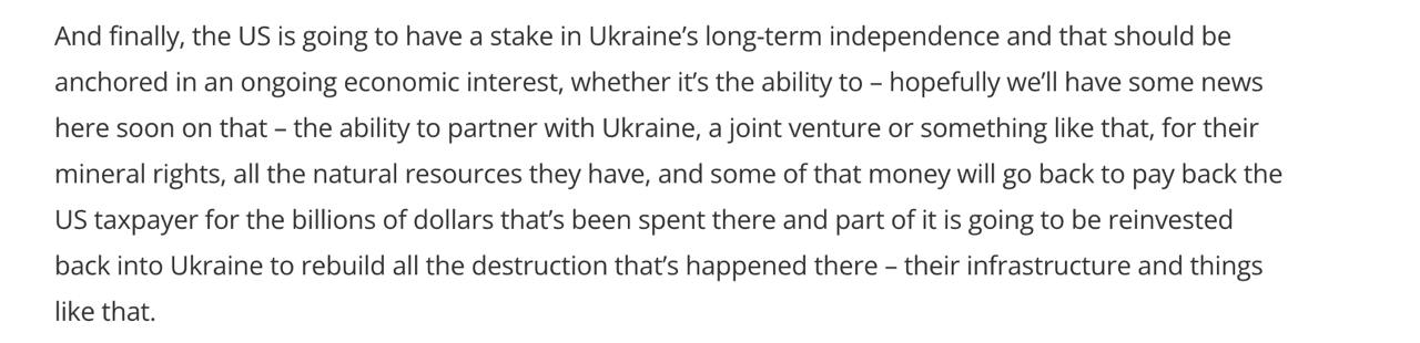 Серед них він перерахував "можливість співпрацювати з Україною, створити спільне підприємство чи щось таке, для отримання прав на видобуток їх корисних копалин, усіх природних ресурсів, які вони мають".