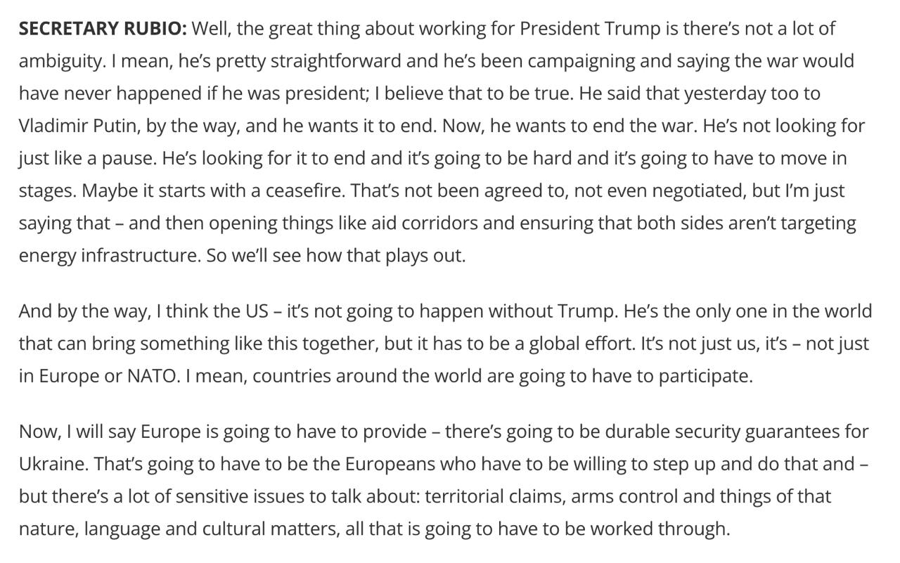 "Можливо, це почнеться з припинення вогню. Це не було погоджено, навіть не обговорювалося, але я просто говорю про це, а потім відкрити такі речі, як коридори допомоги, і забезпечити, щоб обидві сторони не націлювалися на енергетичну інфраструктуру. Тож подивимося, що з цього вийде", - заявив Рубіо.