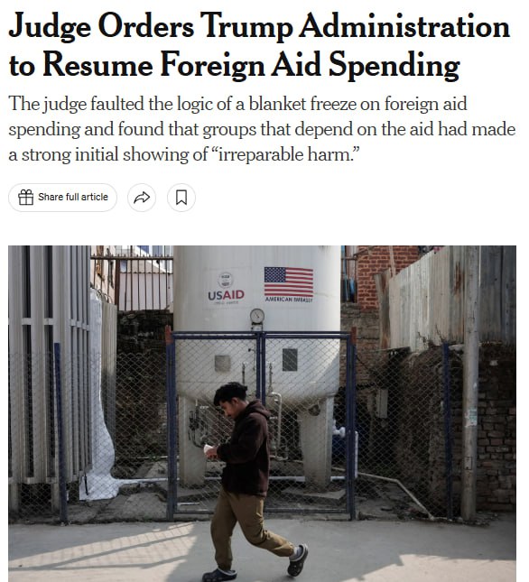 Федеральний суддя Амір Алі (як зазначає видання, призначений Джо Байденом) зобов'язав адміністрацію президента США скасувати указ, який передбачає заморожування на 90 днів програм з надання іноземної допомоги, та відновити фінансування сотень підрядників, які надають іноземну допомогу. Алі послався у своєму рішенні на "масштабну шкоду, яку раптове закриття завдало організаціям" за кордоном.