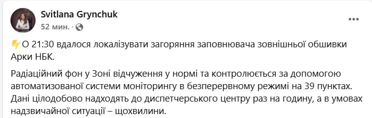 А міністр екології Світлана Грінчук заявила, що на Чорнобильській атомній станції о 21.30 локалізували загоряння на зовнішній обшивці укриття. Вона також запевнила, що радіаційне тло в нормі.