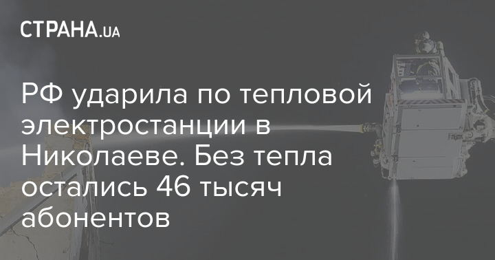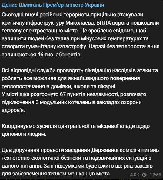 "Сьогодні вночі російські терористи прицільно атакували критичну інфраструктуру Миколаєва. БПЛА ворога пошкодили теплову електростанцію міста. Це зроблено усвідомлено, щоб залишити людей без тепла за мінусових температур і створити гуманітарну катастрофу. Наразі без теплопостачання залишаються 46 тис. абонентів", - написав він.