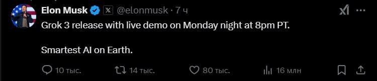 "Випуск Grok 3 з демоверсією в понеділок о 20:00 за тихоокеанським часом. Найрозумніший ШІ на Землі", - написав Маск.