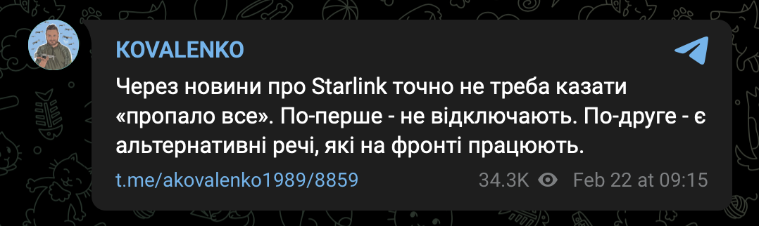 "Через новини про Starlink точно не треба говорити "пропало все". По-перше, не відключають. По-друге, є альтернативні речі, які на фронті працюють", - написав глава ЦПД.